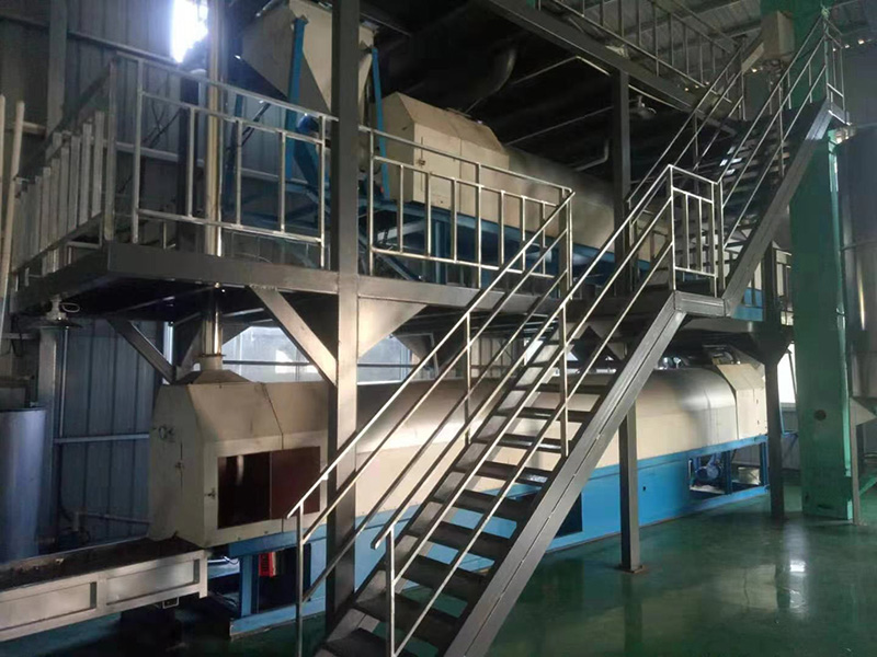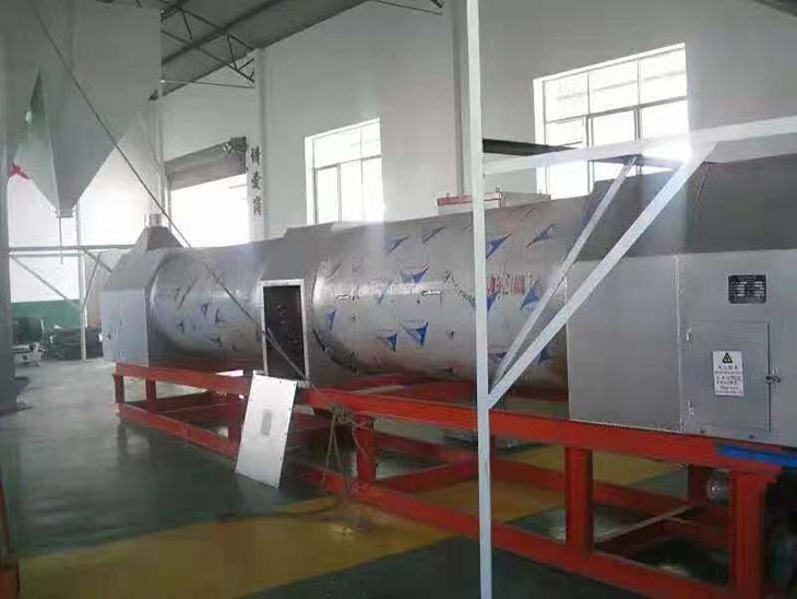 我們解決其技術問題所采用的技術方案是:一種新型環(huán)保節(jié)能熱風炒爐,由電源供電,包括第一燃燒室、第二燃燒室、熱風炒爐滾筒、存料機、自動喂料器、出料機、引風機和排潮風機,所述熱風炒爐滾筒的入口端通過自動喂料器與所述存料斗連通,所述熱風炒爐滾筒的入口端還通過風道與所述排潮風機連通,所述熱風炒爐滾筒的出口端與出料機連通,所述第一燃燒室和第二燃燒室通過風道與引風機連通,所述第一燃燒室和第二燃燒室分別位于所述熱風炒爐滾筒的下方,所述熱風炒爐滾筒軸心線與水平面形成2°到8°的夾角,所述第一燃燒器和第二燃燒器安裝位置在相應燃燒室的前端或者相應燃燒室的兩個側面。我們設備取消了原熱風炒爐所配套的單獨熱風爐、彎段風道或直段風道;在炒爐滾筒下方設計安裝兩份熱風燃燒室,用燃燒器產生的熱風直接對滾筒進行加熱,******限度地縮減了炒爐散熱環(huán)節(jié)和面積,從而實現(xiàn)炒爐連段式加熱。與現(xiàn)有設備相比,我們公司設備充分利用了熱風釋放的熱量,減少了熱量損失,單噸油料或糧食加工消耗添人氣甚至能降低到25nm3,降低了17%,節(jié)能降耗效果非常明顯,得到了客戶的一致好評。與現(xiàn)有設備相比,同等日加工量,所配兩臺燃燒器合計功率比現(xiàn)有設備燃燒器功率下降20%-30%,熱風設定溫度有750-800℃下降到400-500℃,明顯延長了炒爐的使用壽命。第一燃燒室和第二燃燒室的功能各不相同,工作溫度也不一致,第一燃燒室和第二燃燒室能夠實現(xiàn)分段加熱溫度控制,更加靈活與合理,安全可靠,便于操作與控制。